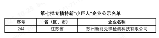 近日,经国家工业和信息化部评审,江苏省工业和信息化厅公示第七批专精特新”小巨人”企业名单,苏州新能先锋凭借在新能源检测领域的深耕细作,卓越的创新能力及突出的市场竞争力,成功入选这一国家级荣誉榜单。