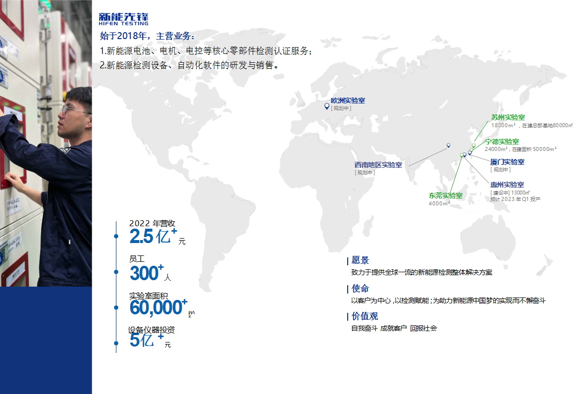苏州新能先锋检测科技有限公司成立于2021年,主营新能源汽车电池、电机等核心零部件检测认证服务,以及相关检测设备、自动化软件的研发与销售,致力于提供全球一流的新能源检测整体解决方案;通过收购原宁德中检检测技术有限公司(2016年成立)和新的投资拓展,全国布局了苏州、宁德、东莞、惠州四大检测基地,就近为行业和客户提供科学公正、优质高效的检测认证服务。2022年营业收入超过2.5亿元,已跃居行业龙头。