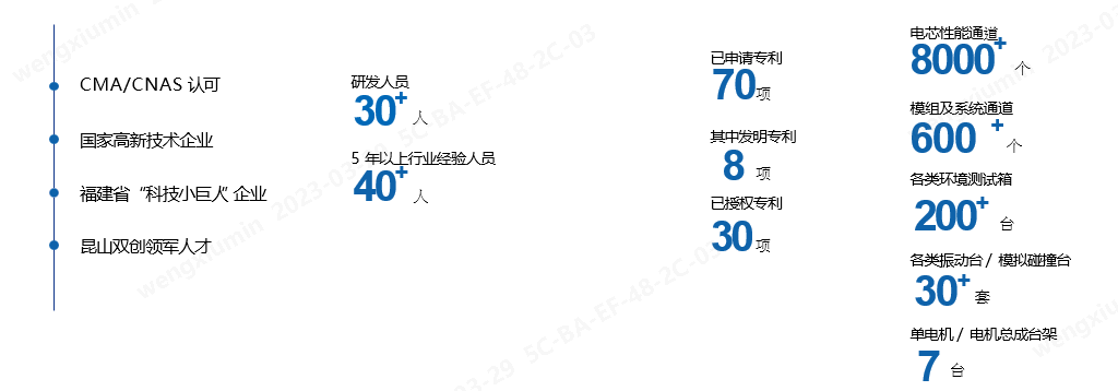 目前公司投资总额超过7亿元,设备仪器类固定资产投资超过5亿元,电池性能测试通道已接近10000个(可同时检测超过8000个电芯、600个模组、350套电池包系统),大中型三综合振动装备近30套,各类自动化检测设备总计超过5000台,动力电池检测能力已覆盖电芯、模组、电池包及储能系统、BMS等各类零部件的完整检测能力和国内外标准要求;已发展成为全球规模领先的第三方新能源电池检测服务机构。